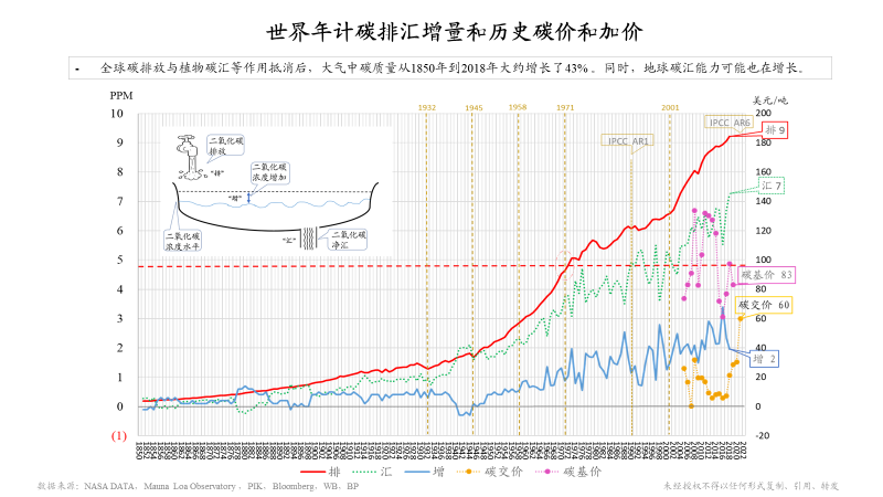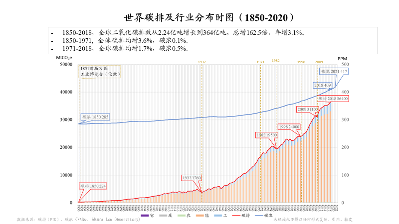 另外,我有兩張圖跟大家分享一下,也是和這個題目相關的。這張圖上面藍線是對我們環(huán)境長期的一個觀測,二氧化碳濃度水平。在夏威夷的莫納羅亞島,從1958年開始有持續(xù)性的觀測,在此之前通過南極冰雪的資料,可以一直追溯到1850年(285PPM)。很有意思1851年全世界第一次工業(yè)博覽會在倫敦召開,也是一個工業(yè)時代到來的標志。經(jīng)過這么長時間的工業(yè)革命,現(xiàn)在可以看到二氧化碳水平已經(jīng)達到417PPM。底下這條紅線,是我們自工業(yè)革命以來的全球碳排放,可以看出明顯增速加快。