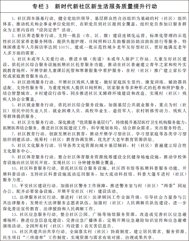 到2025年末,黨建引領社區(qū)服務體系建設更加完善,服務主體和服務業(yè)態(tài)更加豐富,線上線下服務機制更加融合,精準化、精細化、智能化水平持續(xù)提升,社區(qū)吸納就業(yè)能力不斷增強,基本公共服務均等化水平明顯提升,人民群眾操心事、煩心事、揪心事更好解決,獲得感、幸福感、安全感不斷增強。