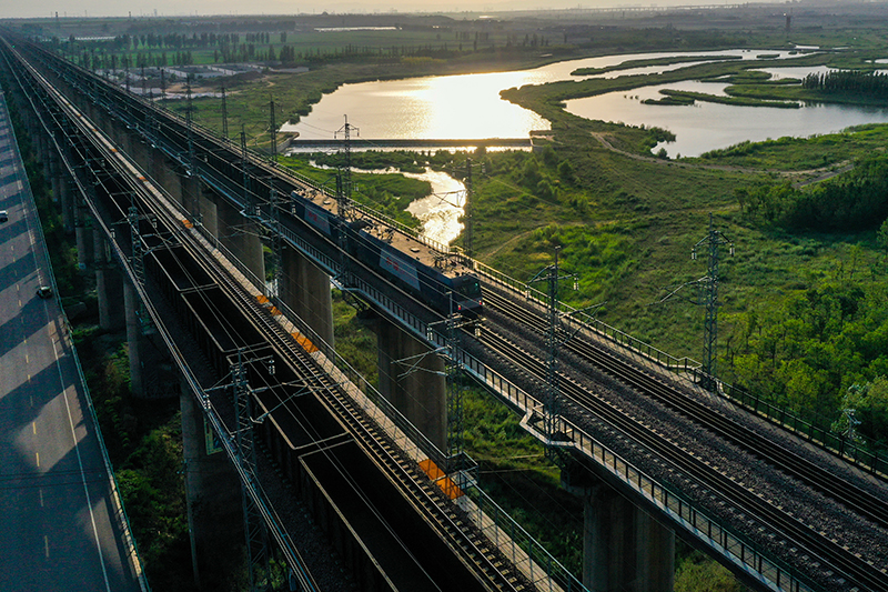 重載列車行駛在大秦鐵路上(2022年7月16日攝,無人機照片)。為做好迎峰度夏能源保供工作,中國鐵路太原局集團有限公司在確保運輸安全的前提下全力提升煤炭運量。新華社記者 曹陽 攝