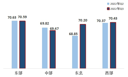 2、從區(qū)域來(lái)看,東北、西部地區(qū)均超越中部地區(qū)。東部、西部、東北、中部指數(shù)分別為70.59、70.43、70.20、69.47。區(qū)域熱度指數(shù)呈適當(dāng)?shù)牡赜蛱卣?,東部地區(qū)第一,西部地區(qū)第二,東北地區(qū)超越中部地區(qū)名列第三,中部地區(qū)最后。東北地區(qū)指數(shù)增幅較大,西部地區(qū)有所增長(zhǎng),東部、中部地區(qū)小幅下滑。