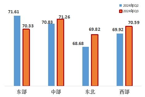 從四大區(qū)域來看,東部、中部、東北、西部地區(qū)分別為70.33、71.26、69.82、70.59,排名分別為中部第一,西部第二,東部第三,東北第四。與上一季度相比,中部、東北、西部地區(qū)改革熱度指數(shù)提升。同比來看,四大區(qū)域均呈現(xiàn)上升趨勢,東北地區(qū)增幅最大。