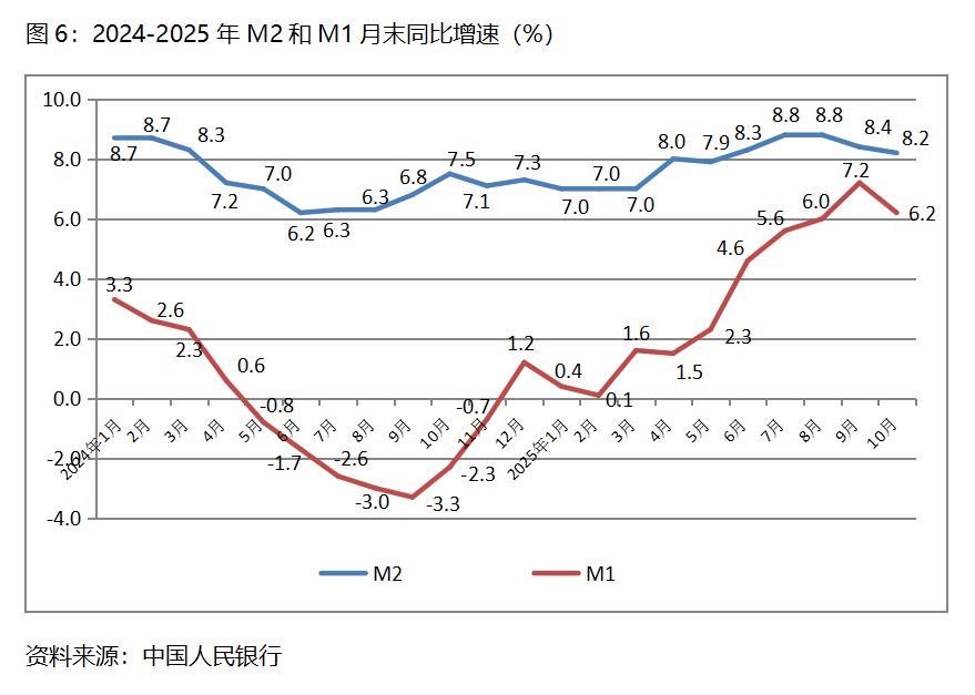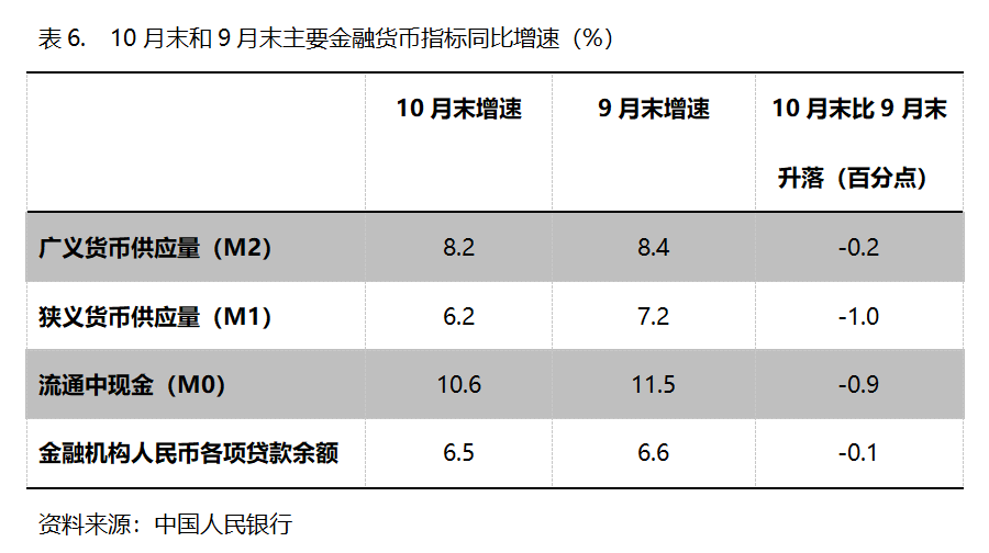 六、M2增速持續(xù)回落。10月末,廣義貨幣供應(yīng)量(M2)同比增長8.2%,比9月末增長8.4%回落0.2個百分點,9月末比8月末增長8.8%回落0.4個百分點;狹義貨幣供應(yīng)量(M1)同比增長6.2%,比9月末增長7.2%回落1.0個百分點,9月末增幅比8月末增長6.0%回升1.2個百分點;流通中貨幣(M0)同比增長10.6%,比9月末增長11.5%回落0.9個百分點,9月末比8月末增長11.7%回落0.2個百分點。10月份末,M2、M1和M0增速均出現(xiàn)了回落,需要關(guān)注其對經(jīng)濟運行走勢的影響。