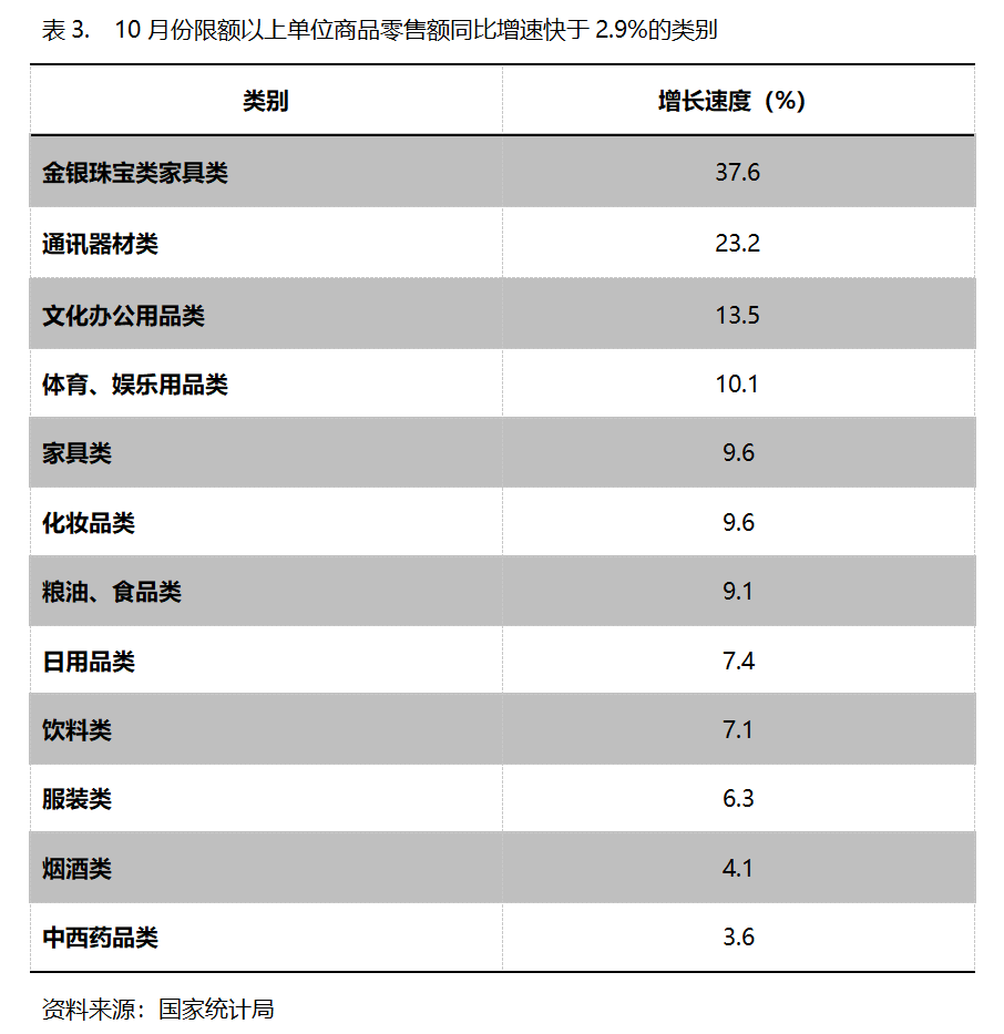 10月份,限額以上單位商品零售額同比增速快于社會消費品零售總額2.9%增速的共有12類,即金銀珠寶類增長37.6%,通訊器材類增長23.2%,文化辦公用品類增長13.5%,體育、娛樂用品類增長10.1%,家具類增長9.6%,化妝品類增長9.6%,糧油、食品類增長9.1%,日用品類增長7.4%,飲料類增長7.1%。服裝類增長6.3%。煙酒類增長4.1%,中西藥品類增長3.6%。