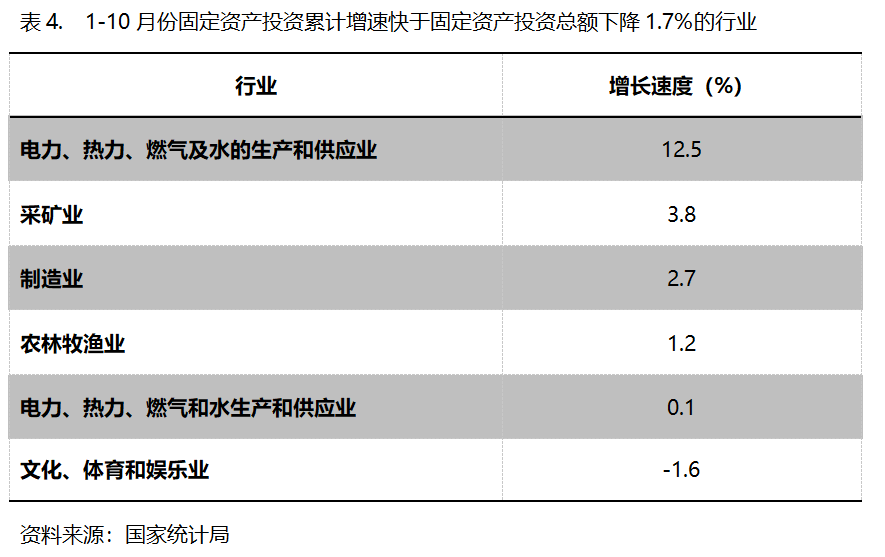 1-10月份,固定資產(chǎn)投資累計增速快于固定資產(chǎn)投資總額下降1.7%的行業(yè)共6個,即電力、熱力、燃氣及水的生產(chǎn)和供應(yīng)業(yè)增長12.5%,采礦業(yè)增長3.8%,制造業(yè)增長2.7%。農(nóng)林牧漁業(yè)增長1.2%,交通運輸、倉儲和郵政業(yè)增長0.1%,文化、體育和娛樂業(yè)下降1.6%。