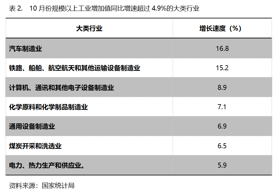 10月份,增長速度超過規(guī)模以上工業(yè)增長4.9%的主要大類行業(yè)共有7個,即汽車制造業(yè)增長16.8%,鐵路、船舶、航空航天和其他運輸設(shè)備制造業(yè)同比增長15.2%,計算機、通訊和其他電子設(shè)備制造業(yè)增長8.9%,化學(xué)原料和化學(xué)制品制造業(yè)增長7.1%,通用設(shè)備制造業(yè)增長6.9%,煤炭開采和洗選業(yè)增長6.5%,電力、熱力生產(chǎn)和供應(yīng)業(yè)增長5.9%。