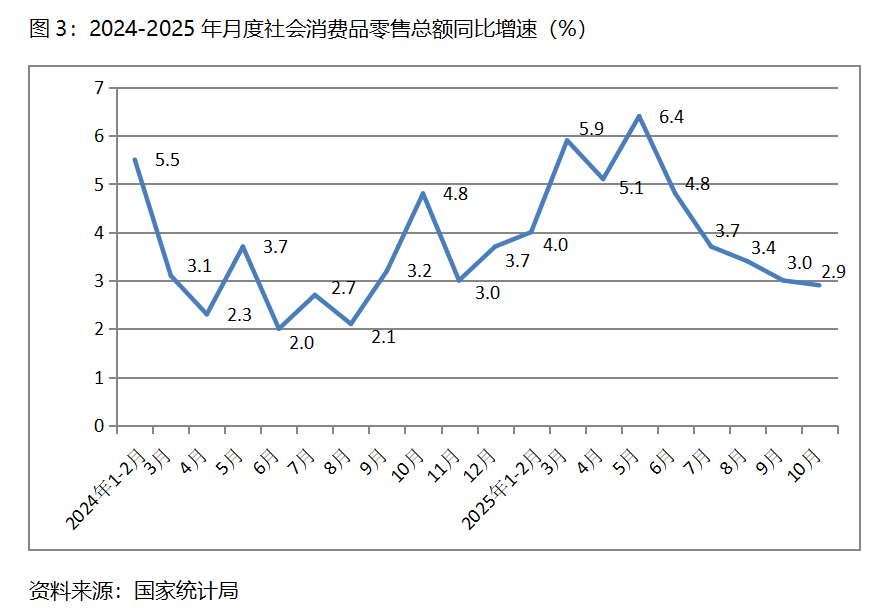 三、零售增速持續(xù)回落。10月份,社會消費品零售總額同比增長2.9%,比9月份增長3.0%回落了0.1個百分點,9月份比8月份增長3.4%回落了0.4個百分點,其中,餐飲收入增速回升,商品零售額增速回落,10月份餐飲收入同比增長3.8%,比9月份增長0.9%回升了2.9個百分點;商品零售額增長2.8%,比9月份增長3.3%回落0.5個百分點。10月份社會消費品零售總額增速是今年以來月份的最低增速。