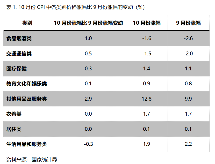 10月份,在CPI 8個類別中有5個類別同比漲幅回升,2個類別持平,1個類別回落。漲幅回升的5個類別包括食品類價格降幅縮小1.0個百分點,交通類降幅縮小0.5個百分點,醫(yī)療保健類漲幅回升0.3個百分點,教育文化和娛樂類漲幅回升0.1個百分點,其他用品和服務(wù)類漲幅回升2.9個百分點;漲幅持平的2 個類別包括衣著類和居住類;漲幅回落的生活用品及服務(wù)類漲幅回落0.3個百分點。