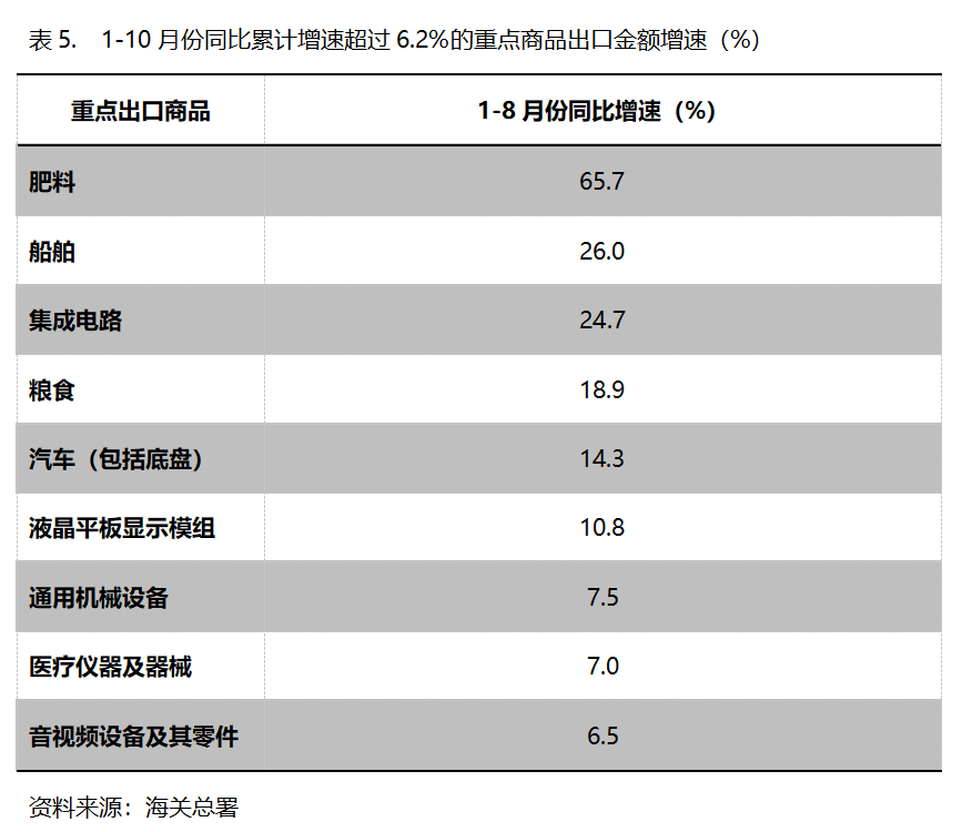 1-10月份,出口金額同比增速超過6.2%的重點商品共有9類,即肥料出口增長65.7%,船舶增長26.0%,集成電路增長24.7%,糧食增長18.9%,汽車(包括底盤)增長14.3%,液晶平板顯示模組增長10.8%,通用機器設(shè)備增長7.5%,醫(yī)療儀器及器械增長7.0%,音視頻設(shè)備及其零件增長6.5%。
