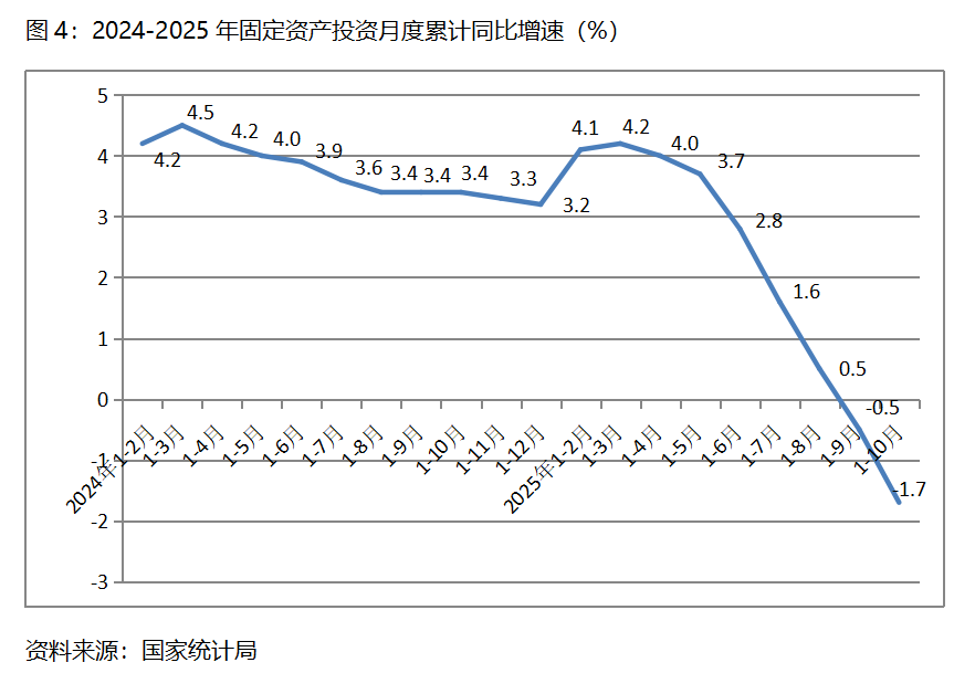 四、投資增速持續(xù)下降。1-10月份,固定資產(chǎn)投資總額同比下降1.7%,比1-9月份下降0.5%擴大了1.2個百分點,1-9月份增速由1-8月份增長0.5%轉(zhuǎn)為下降0.5%,增速由年初以來的持續(xù)回落轉(zhuǎn)為連續(xù)兩個月的下降。1-10月份國有控股投資同比增長0.1%,比1-9月份增長1.0%回落0.9個百分點;民間投資下降4.5%,比1-9月份下降3.1%擴大了1.4個百分點。三次產(chǎn)業(yè)投資中,第一產(chǎn)業(yè)投資同比增長2.9%,比1-9月份增長4.6%回落1.7個百分點;第二產(chǎn)業(yè)投資增長4.8%,比1-9月份增長6.3%回落1.5個百分點;第三產(chǎn)業(yè)投資下降5.3%,比1-9月份下降4.3%擴大1.0 百分點。固定資產(chǎn)投資增速自年初以來持續(xù)回落轉(zhuǎn)為近兩個月的持續(xù)下降,呈現(xiàn)出投資后勁乏力的苗頭。