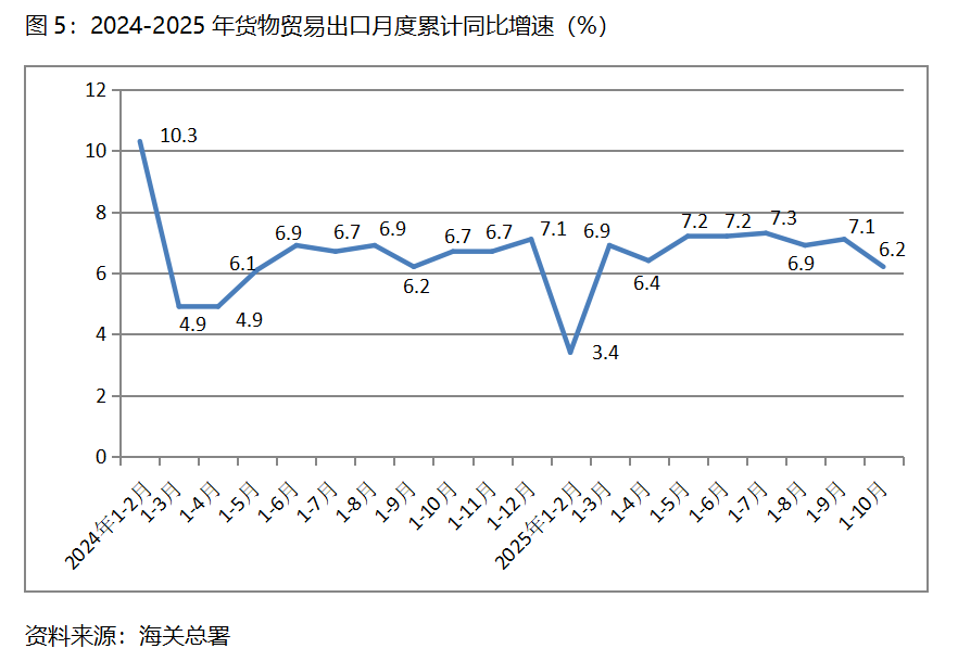 五、出口增速由升轉(zhuǎn)落。1-10月份,貨物出口同比增長6.2%,比1-9月份增長7.1%回落0.9個百分點,1-9月份比1-8月份增長6.9%回升0.2個百分點。貨物出口對主要貿(mào)易出口經(jīng)濟體增速均出現(xiàn)回落,1-10月份對歐盟出口同比增長8.4%,比1-9月份對歐盟出口同比增長9.2%回落0.8個百分點;對美國出口下降17.1%,比1-9月份下降16.2%擴大0.9個百分點;對東盟出口增長15.3%,比1-9月份增長15.8%回落0.5個百分點;對拉丁美洲出口增長7.3%,比1-9月份增長7.8%回落0.5個百分點;對非洲出口增長27.2%,與1-9月份增長29.4%回落2.2個百分點。盡管1-10月份出口保持了不低的增速,但10月份出現(xiàn)0.8%的下降,值得引起密切關(guān)注。