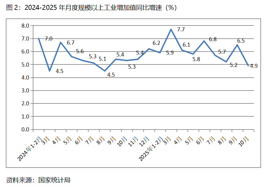 二、工業(yè)增速由升轉(zhuǎn)落。10月份,規(guī)模以上工業(yè)增加值同比增長4.9%,比9月份增長6.5%回落了1.6個百分點,9月份比8月份增長5.2%回升了1.3個百分點。從工業(yè)三大門類看,采礦業(yè)和制造業(yè)增速比上月回落,電力、熱力、燃氣及水生產(chǎn)和供應(yīng)業(yè)增速回升,10月份,采礦業(yè)同比增長4.5%,比上月增長6.4%回落1.9個百分點;制造業(yè)增長4.9%,比上月增長7.3%回落2.4個百分點;電力、熱力、燃氣及水生產(chǎn)和供應(yīng)業(yè)增長5.4%,比上月增長0.6%回升4.8個百分點。值得關(guān)注的是,10月份工業(yè)增速回落到了今年月份增速的最低點。