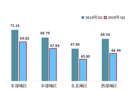 2.從四大區(qū)域來看,東部和中部地區(qū)繼續(xù)保持第一、第二,東北地區(qū)從上季度開始落后西部地區(qū)的情況沒有發(fā)生改變,而且差距呈擴(kuò)大趨勢;